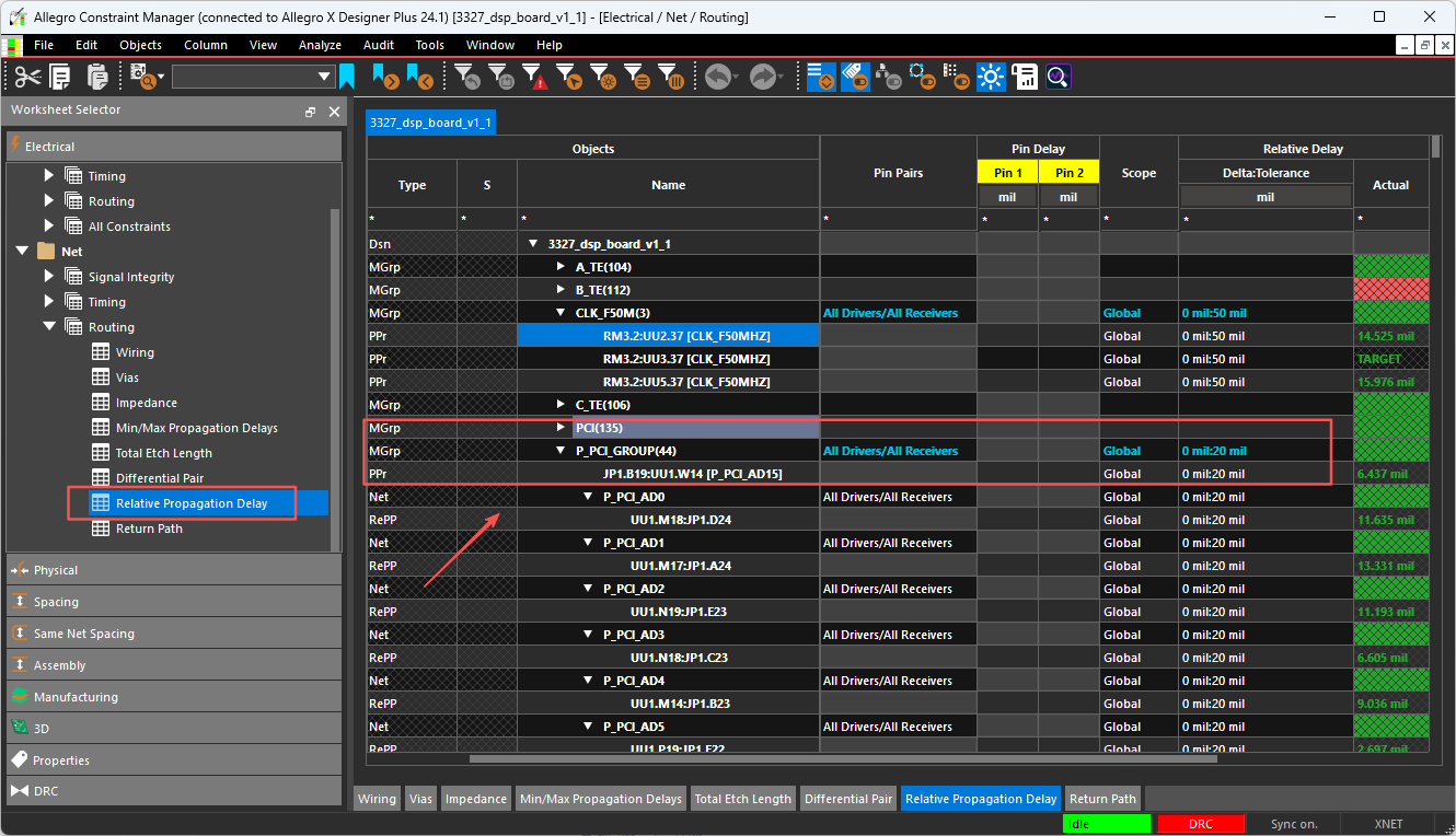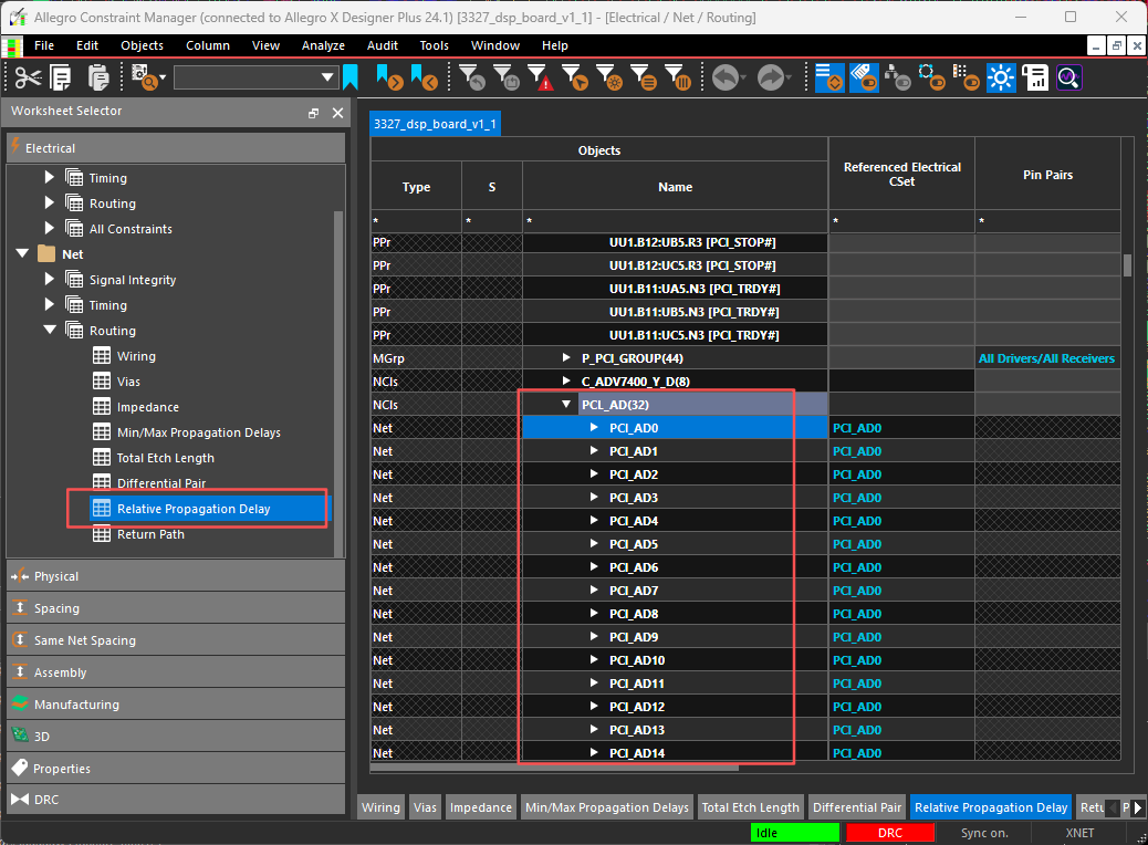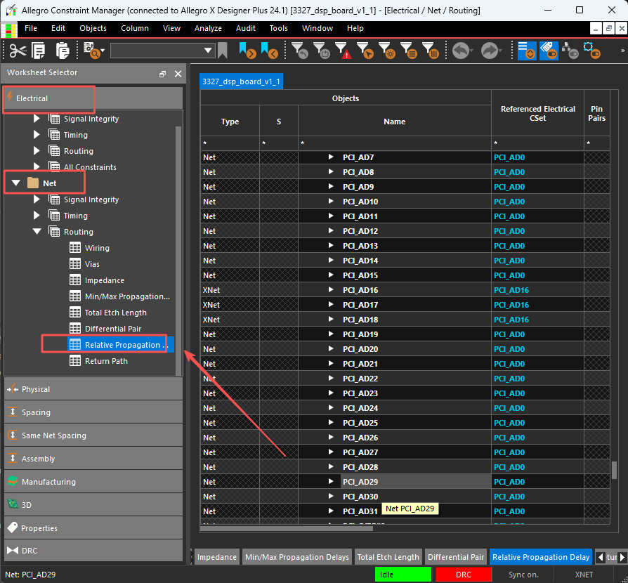 2.打开规则约束管理器,点击选择Setup-Constraints-Electrical,在窗口中选择Net-Routing-Relative Propagation Delay,查看走线约束。
