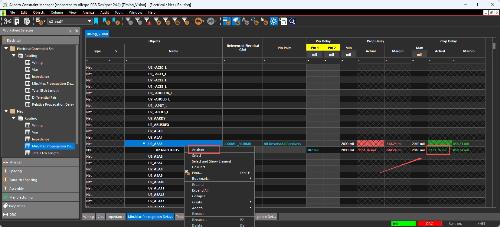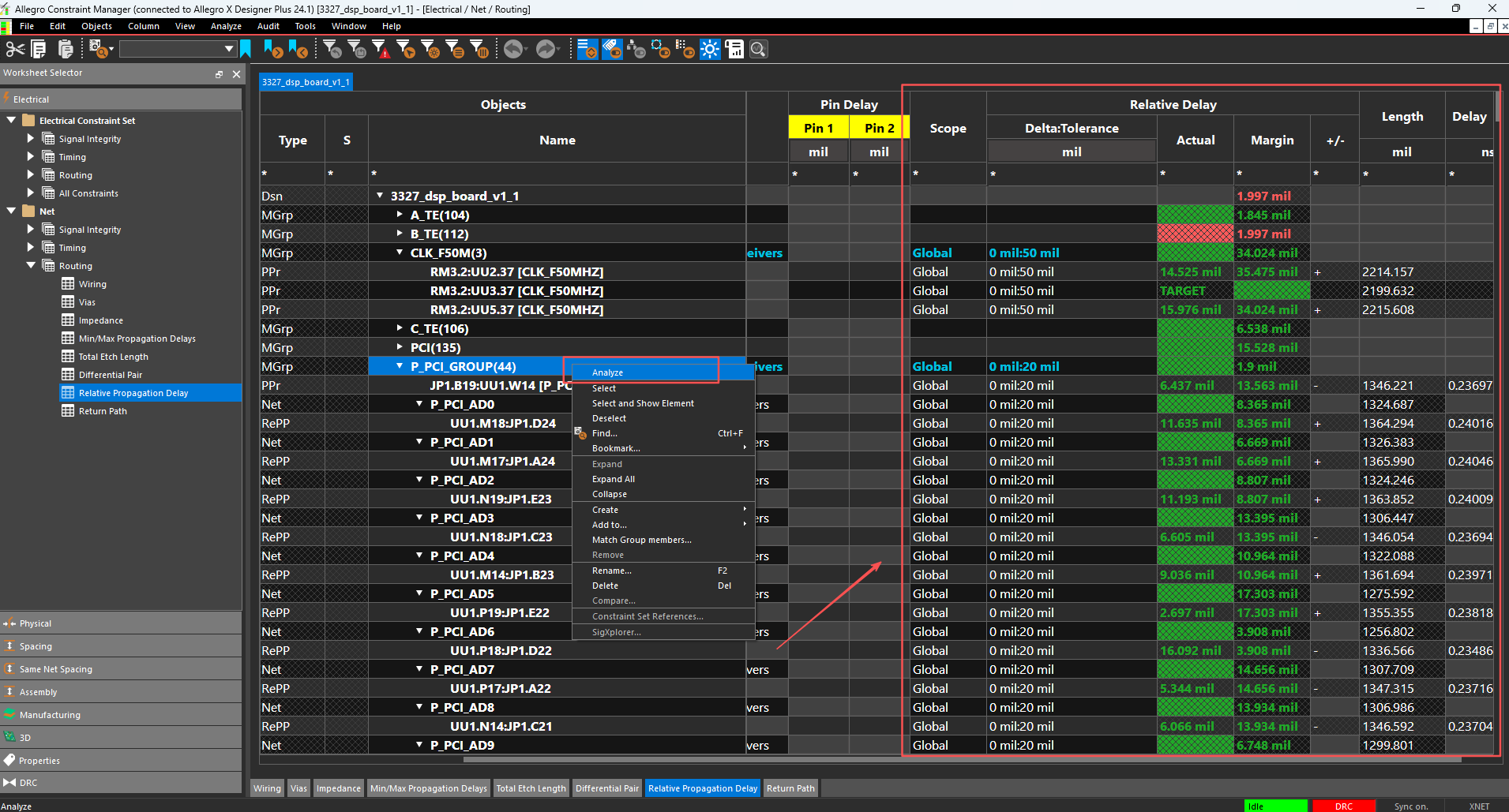 5.规则约束管理器通过内置的场求解器来管理和分析电气规则。鼠标右键点击一个网络组选择Analyze。在相对延迟中的红色数值代表该网络与指定的长度偏差超过了20mil;绿色数值则代表为安全范围内的值。