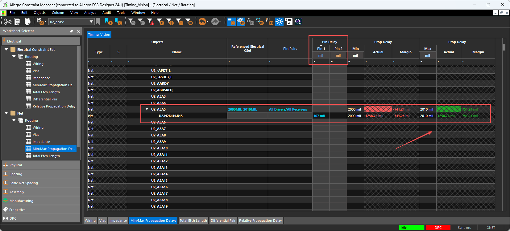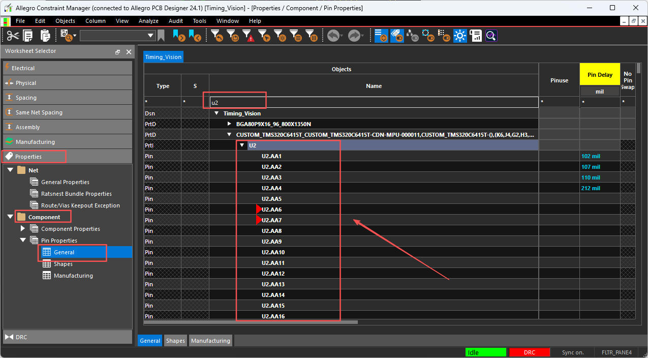 5.在Objects输入位号u2进行筛选,展开筛选结果,可以看到Pin Delay已按表格进行了映射,在表格中也支持手动修改Pin 延迟值。