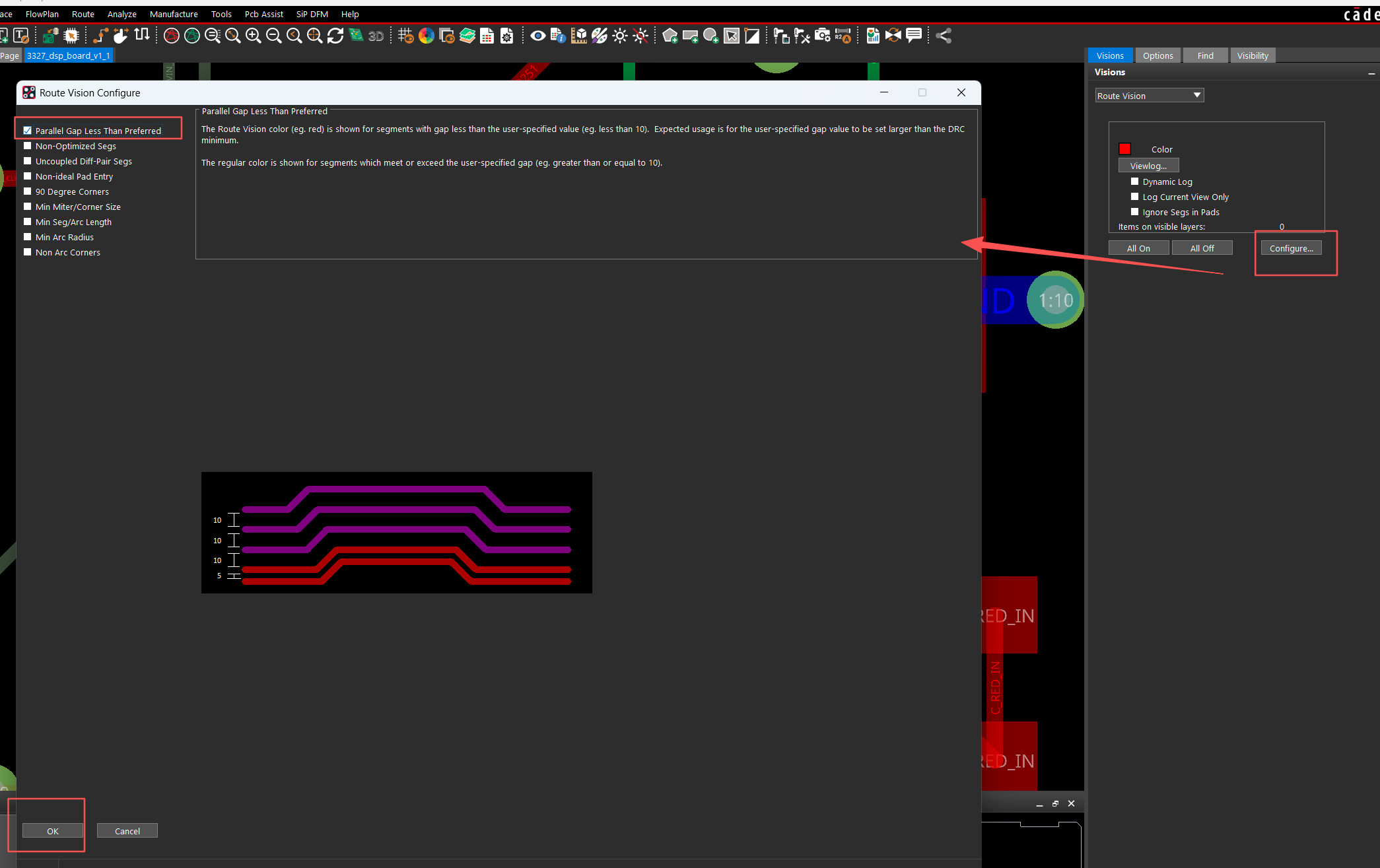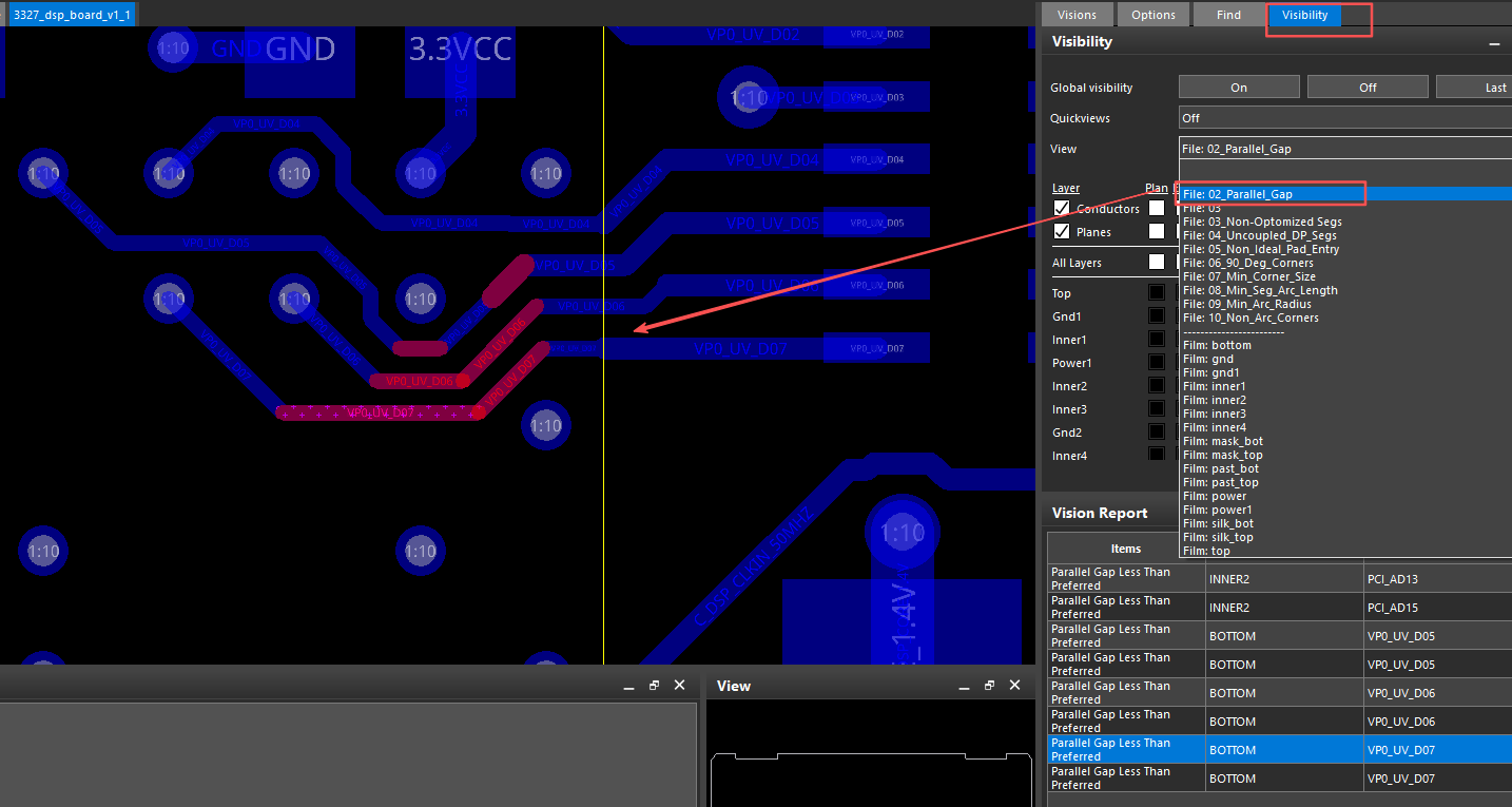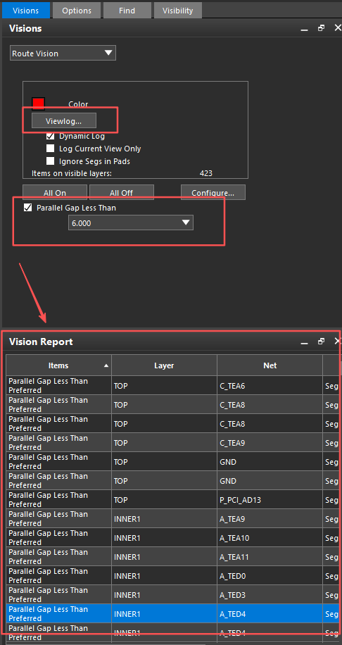 8.点击Viewlog,接着在下方的Vision Report界面就可以查看平行线之间的距离小于标准值的层以及网络的报告,双击报告中的某一项内容,allegro会自动定位到未满足距离要求的走线上。