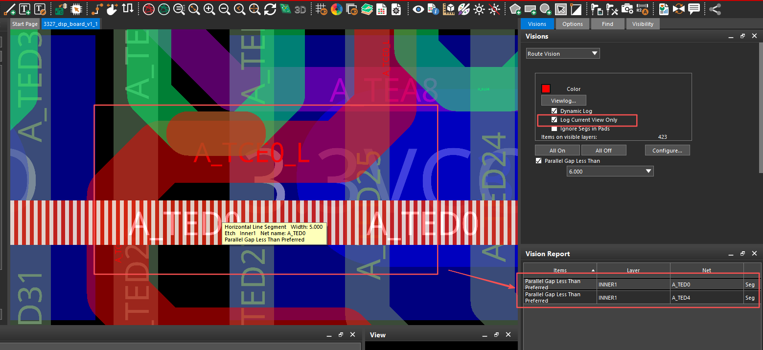 9.在Visions界面勾选Log Current View Only,当在Allegro的布线界面进行缩放操作时,Vision Report会迅速缩减为仅包含在视图中显示的区域的项目,更好的对布线进行局部优化;当我们在视图中对于布线进行优化完成后,走线将由红色恢复为正常走线颜色,同时动态日志也会自动更新。