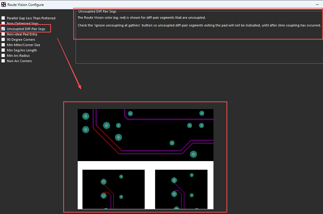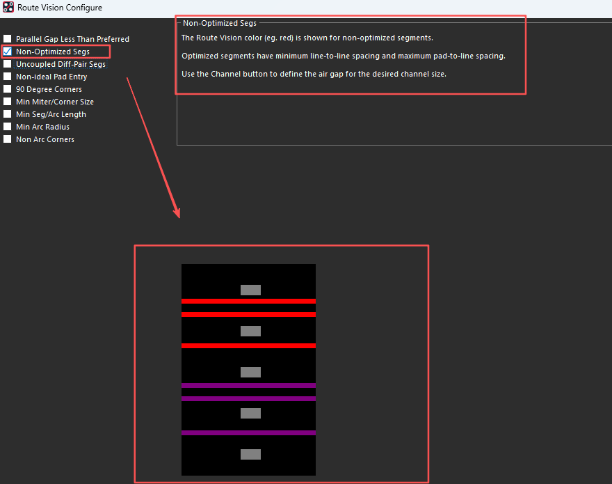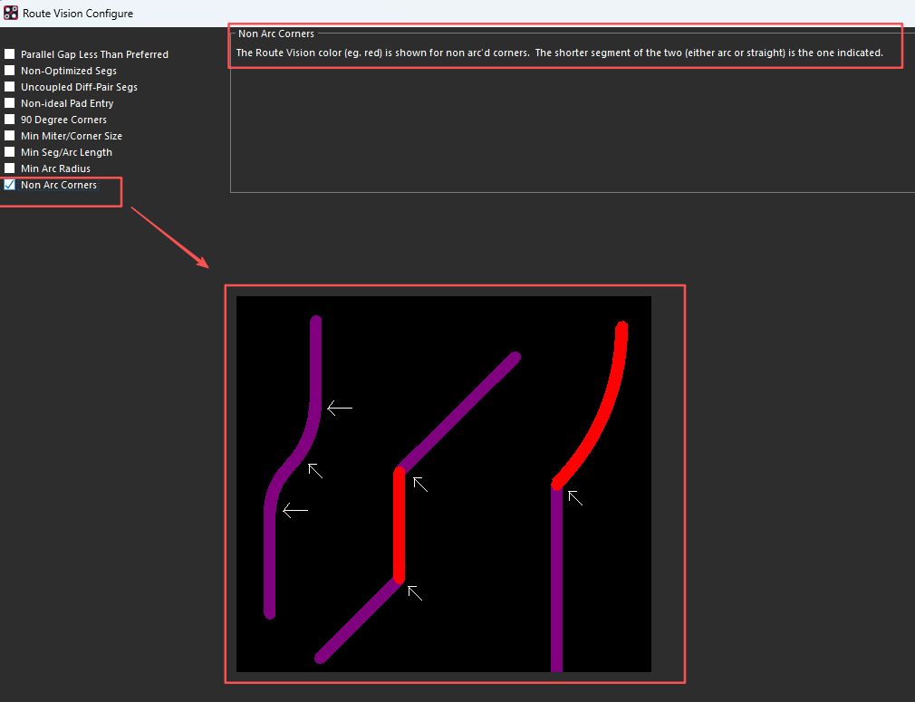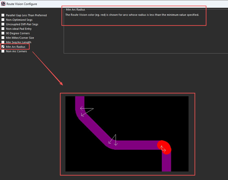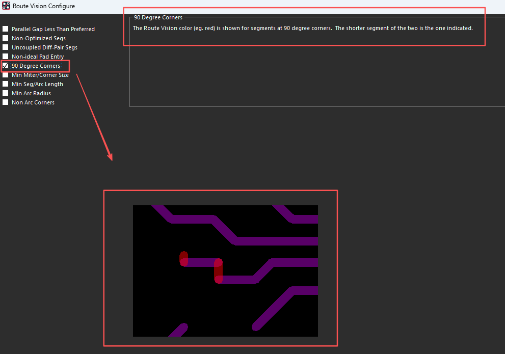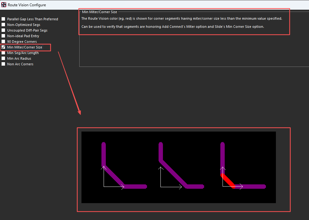5.Min Miter/Corner Size:用于确定低于设定参数的转角位置,验证走线中的斜坡/管脚是否满足要求。