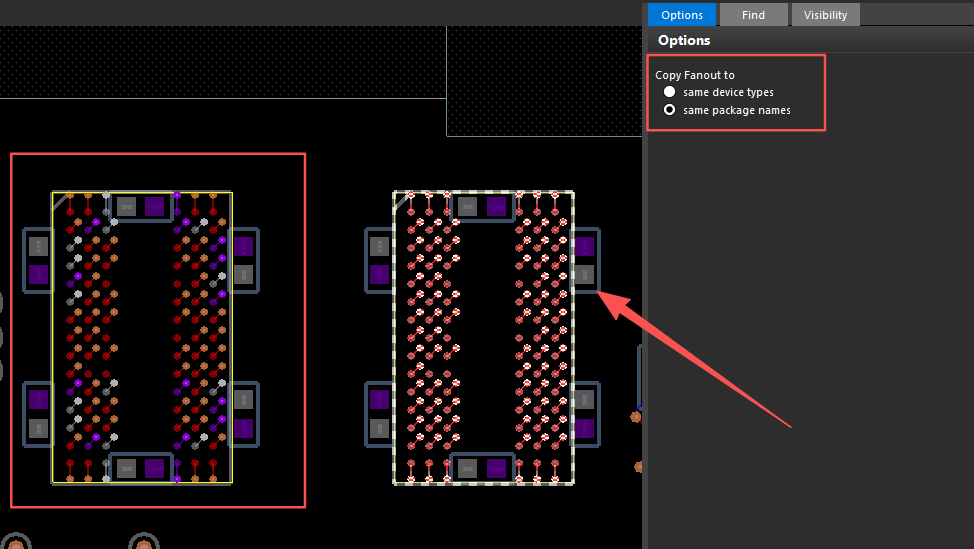 3.在Find界面仅勾选Symbols,接着点击封装器件,可以看到旁边的相同的封装形式的封装扇出形式一比一复制扇出方式。