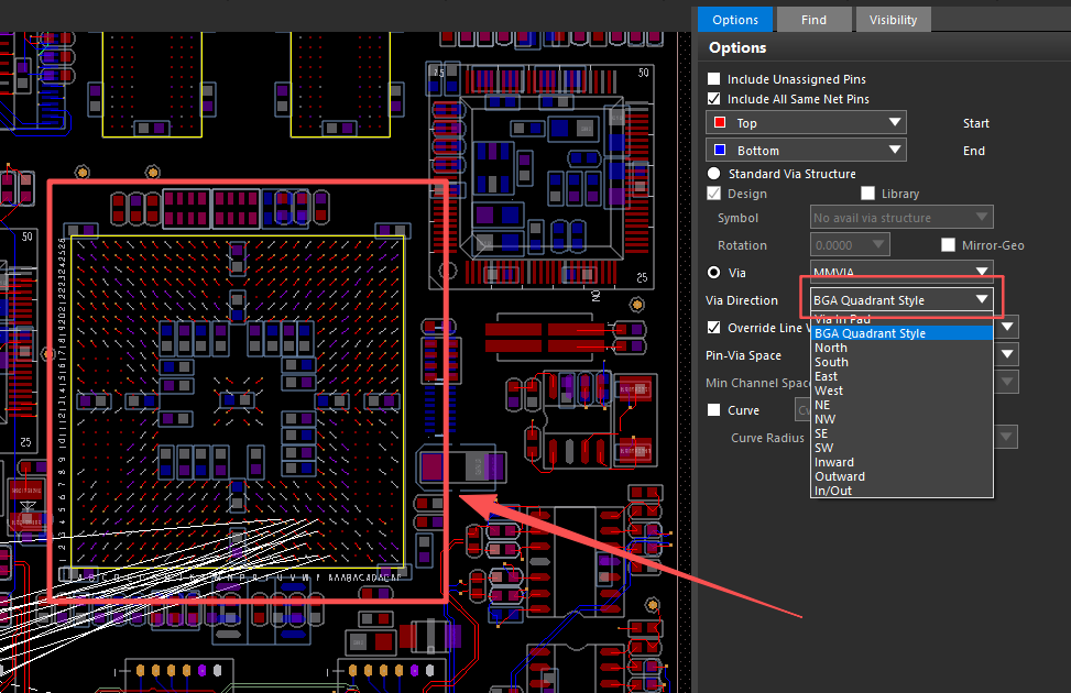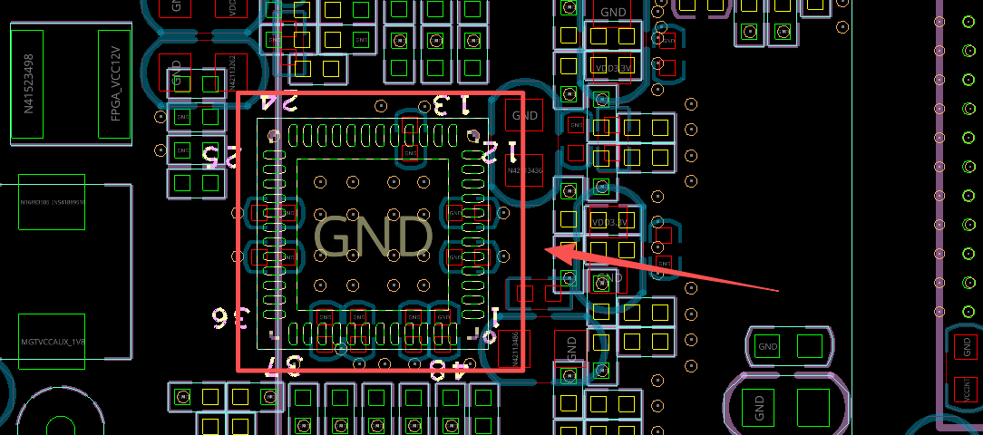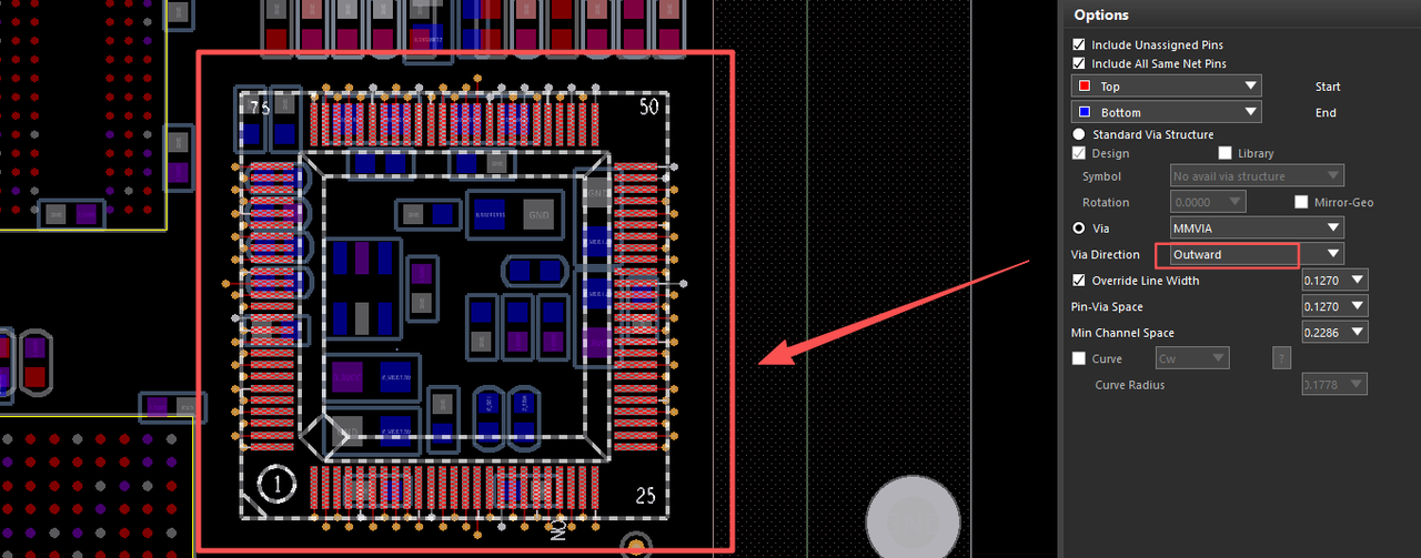 对于中间的散热焊盘,使用多个过孔阵列直接扇出到内地平面,提高散热和接地质量。对于四周的信号引脚,采用常用的向外扇出方式。