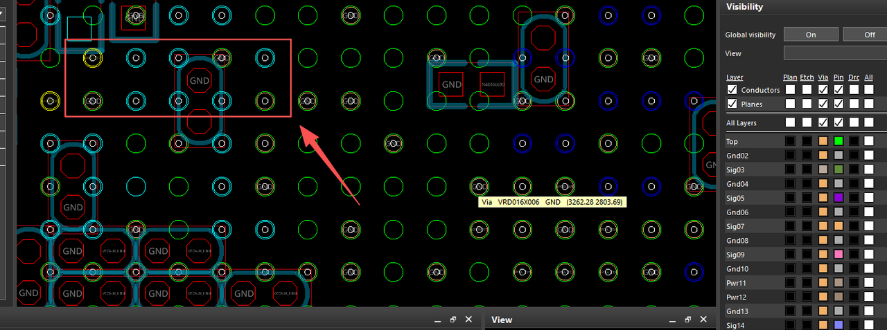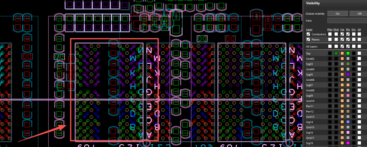 此类封装打孔需要注意不能把孔打得太密集造成信号回流地平面和电源平面不完整,故在打孔时需要错开打孔,保证每两个VIA之间可以通过1~2根走线。
