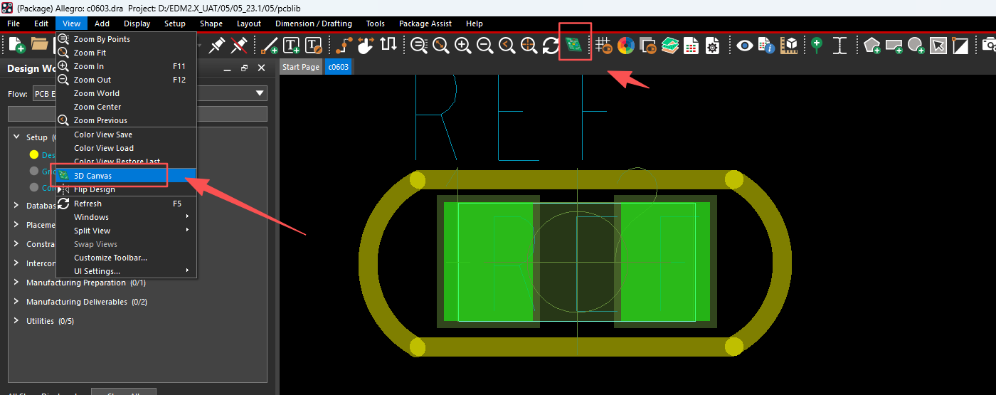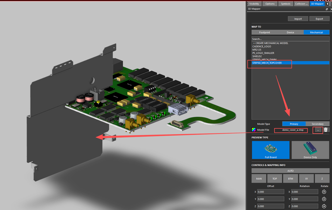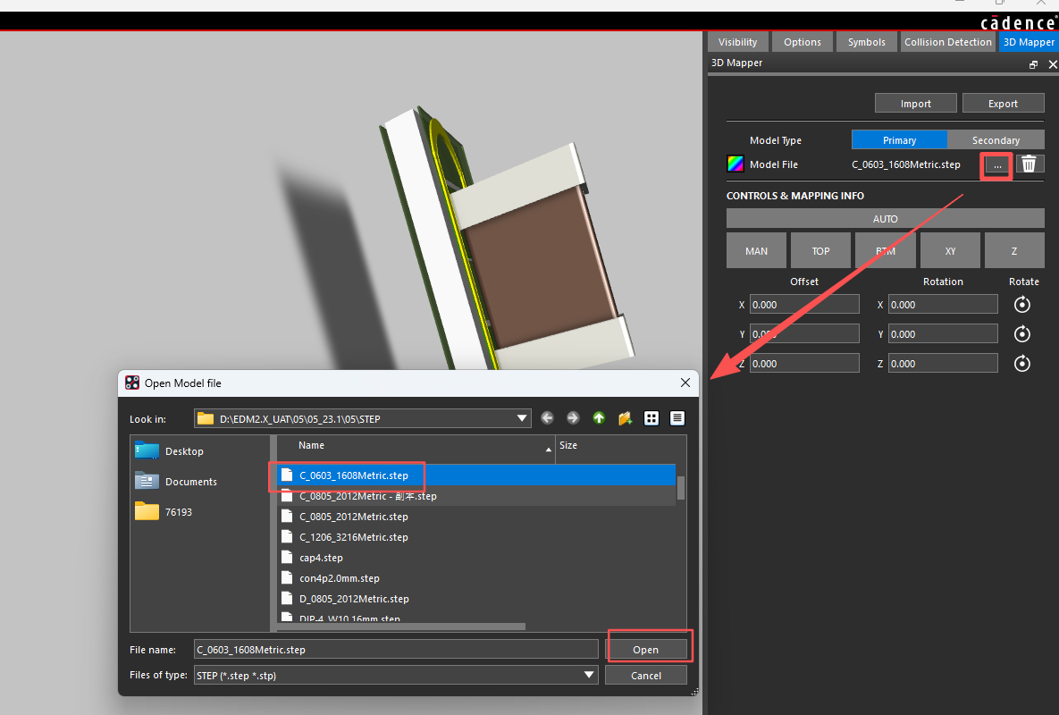 2.导入3D model文件,点击Allegro 3D Canvas界面的右侧的浏览界面,选择对应的step模型。