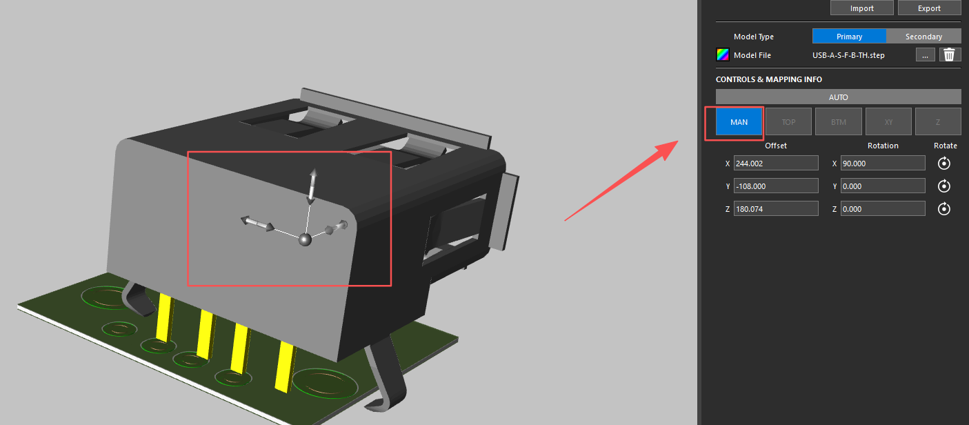 3.模型成功导入后,模型与footprint若处于未对齐的状态,可通过自动对齐或手动调整使模型对齐。在模型相对简单的情况下,点击“Auto”按钮可实现大部分模型的自动对齐。
