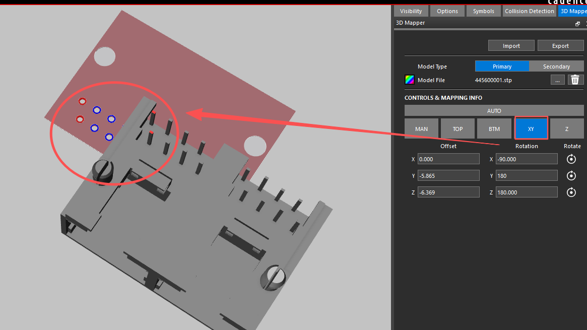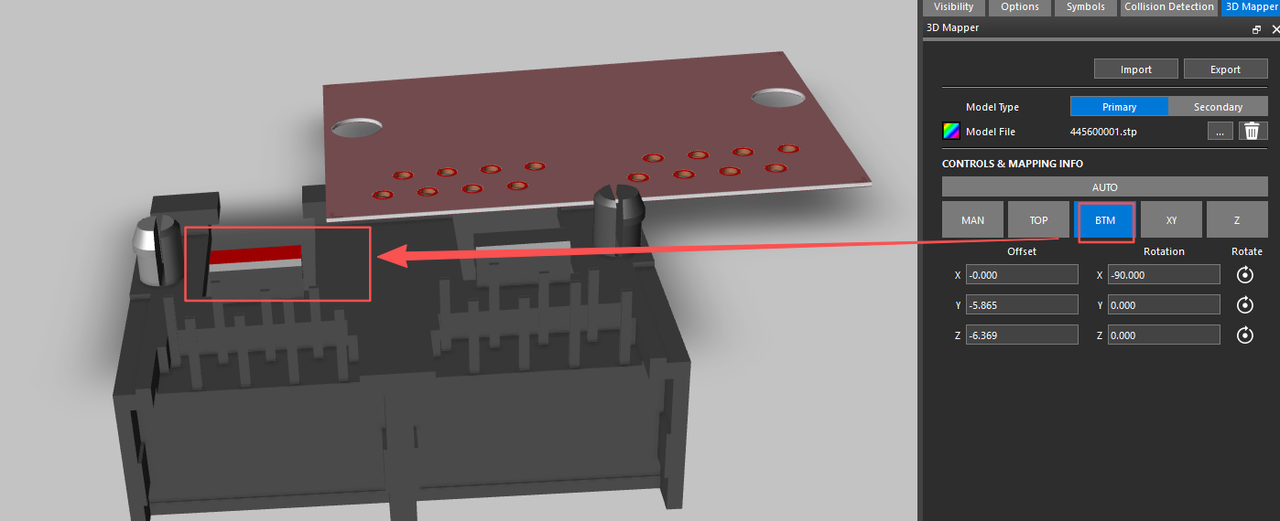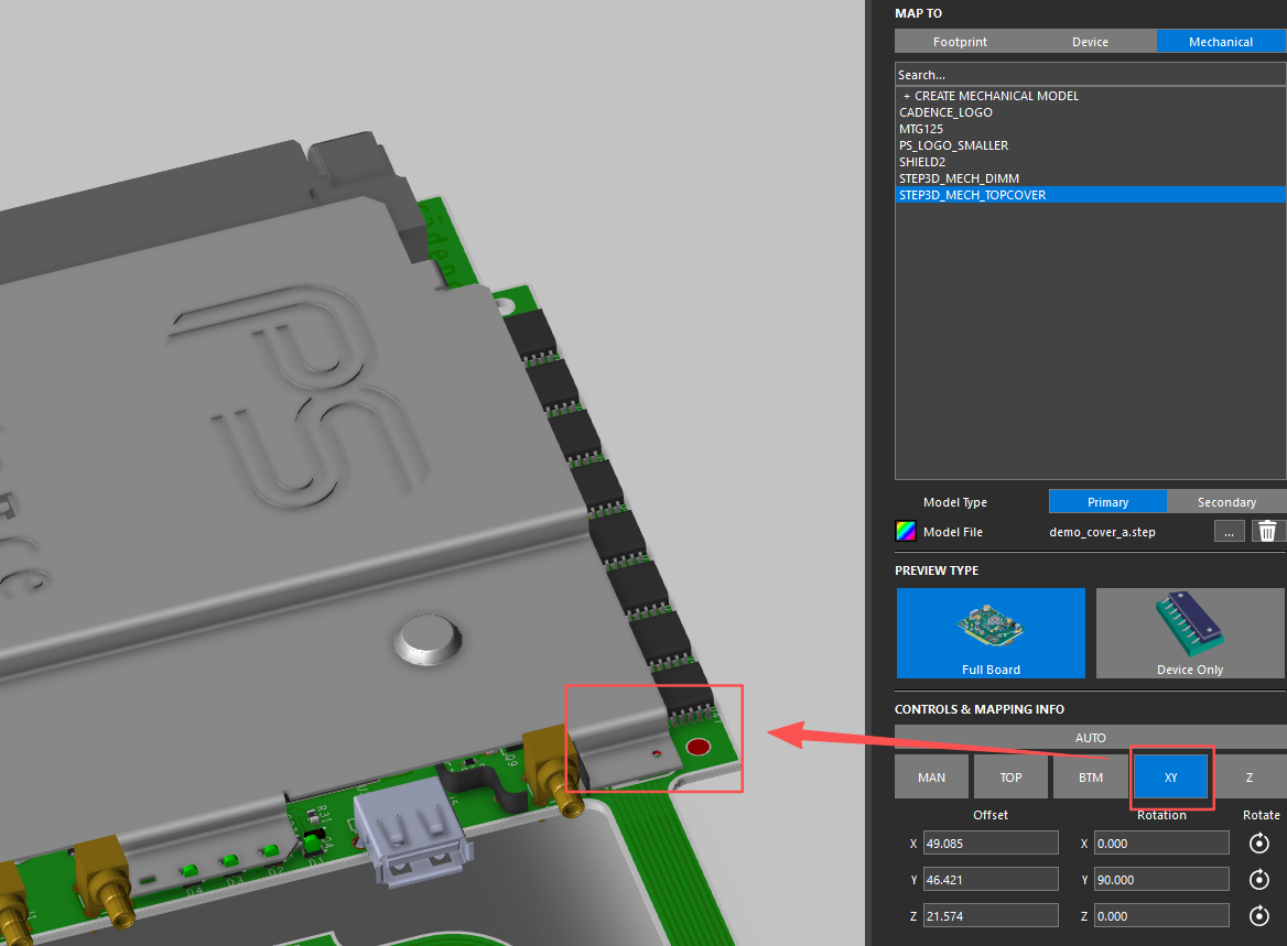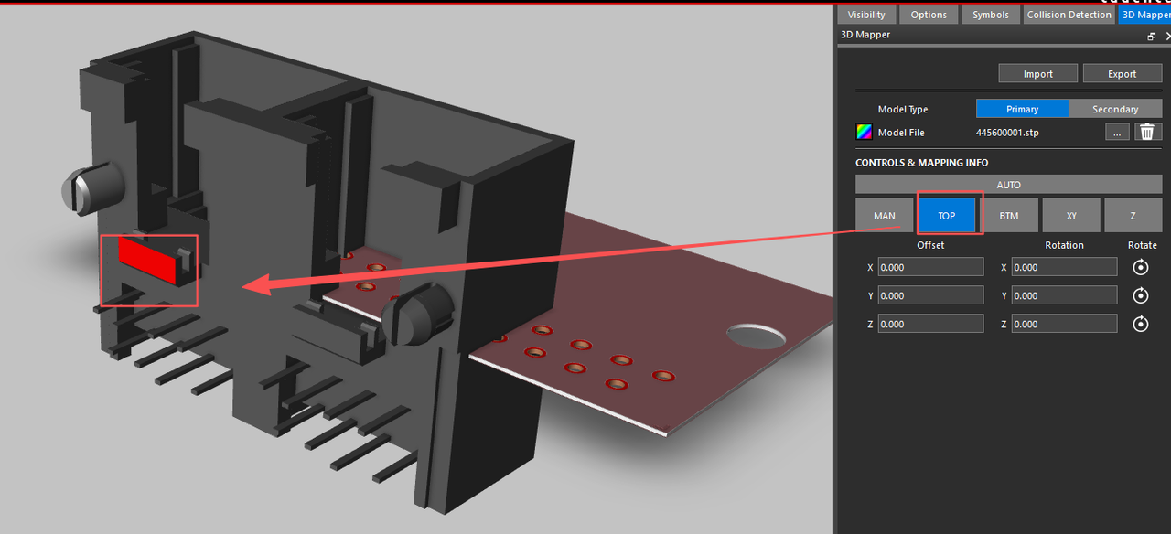 3.采用手动的方式进行调节对齐,首先点击TOP将该机械模型与PCB的铜皮表面对齐,接着通过“XY”进行点位对齐。