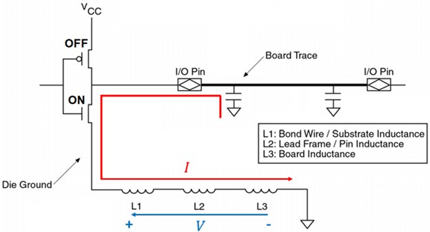要了解此类噪声的成因,以及同步开关噪声产生的物理机制,我们可以分析单个缓冲电路。