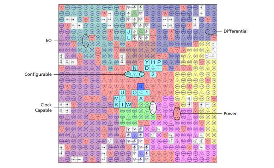 图 1:具有不同类型可配置引脚的多存储体现场可编程门阵列(FPGA)的 I/O 颜色编码图