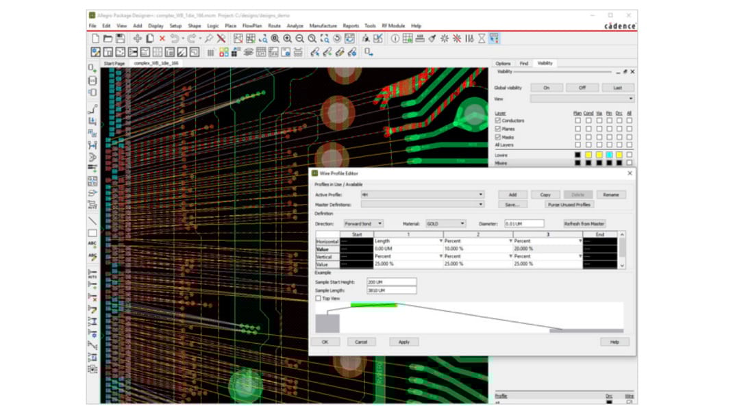 图 1:以约束为驱动的交互式引线键合包含跨多个引线层级的推挤功能;三维引线轮廓查看器 / 编辑器支持创建并兼容多 种引线轮廓;参考轮廓库可实现具备可制造性感知的设计及精准仿真。