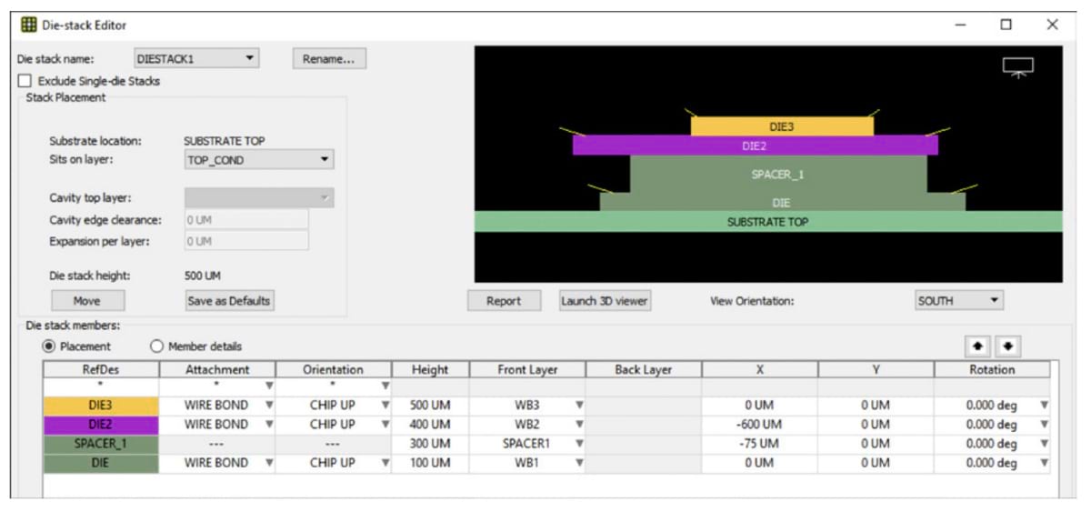 图 4:管芯堆叠编辑器(Die Stack Editor)可对包含间隔层与中介层的复杂管芯堆叠 结构进行管理,且支持在管芯两侧实现互连。