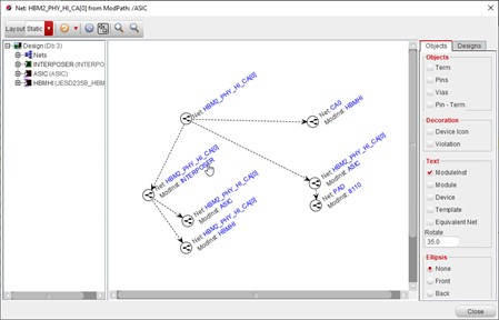 系统级互连可通过网表编辑器(Netlist Editor)功能或网络图形(Net Graph)功能进行分析。如图 8 所示,网络图形会显示网络的完整拓扑结构,包括该网络上存在的已映射子网络名称、端接元件、 引脚以及过孔。
