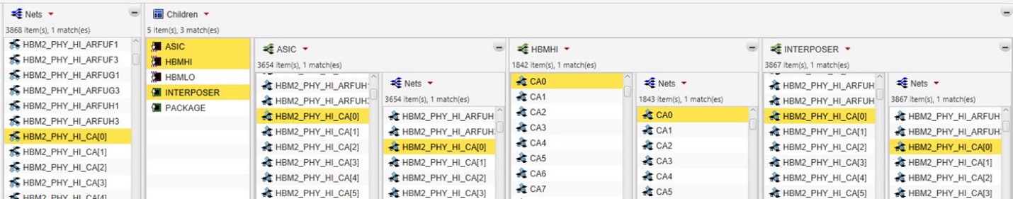 创建接触层还会在器件之间建立逻辑关系。通过接触焊盘的定义,网络会自动传播到被连接的器件 中。对于高带宽内存(HBM)等复制型管芯,网络名称前缀可对其网络名称进行唯一标识。之后,可通 过映射网络,在具有不同网络名称的器件之间建立互连。