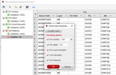 如图 4 所示,执行基板间互连检查的目的是验证接触层的完整性。检查内容包括引脚接触百分比、 引脚偏移量、引脚数量不匹配、端接方向以及网络映射。系统会列出所有违规项,且可高亮显示存在 问题的对象。该功能有助于在整个设计流程中保持系统设计互连的完整性。
