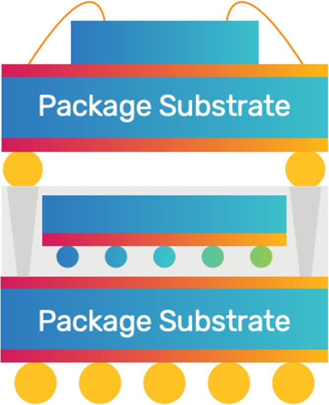 多年来逐步发展起来的另一种封装方案是堆叠封装(PoP,见图 2)—— 在该方案中,一个 封装可直接安装在另一个封装的顶部,并通过模塑通孔(through molding vias)实现连接。堆叠 封装组件虽可归为三维封装范畴,但该方案在性能、功耗、密度及外形尺寸方面,均无法达到真正 的三维集成电路(3D-IC)水平。
