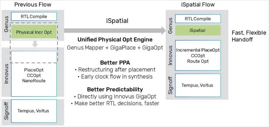 - Cadence数字全流程iSpatial技术:iSpatial技术将Innovus 设计实现系统的GigaPlace 布线引擎和GigaOpt 优化器集成到Genus 综合解决方案,支持布线层分配,有效时钟偏移和通孔支柱等特性。iSpatial技术让用户可以使用统一的用户界面和数据库完成从Genus物理综合到Innovus设计实现的无缝衔接。